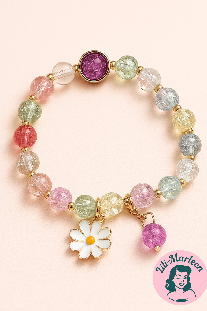 Et smykke, der stråler af glæde og forår! “Little Miss Daisy” er et elastisk børnearmbånd sammensat af fine pastelperler i rosa, grønne, gule og blå nuancer – alle med en let glans, der fanger lyset smukt. Armbåndet er pyntet med et sødt margueritvedhæng i hvid og guld samt en lille gennemsigtig perle, der giver et ekstra strejf af leg og elegance.