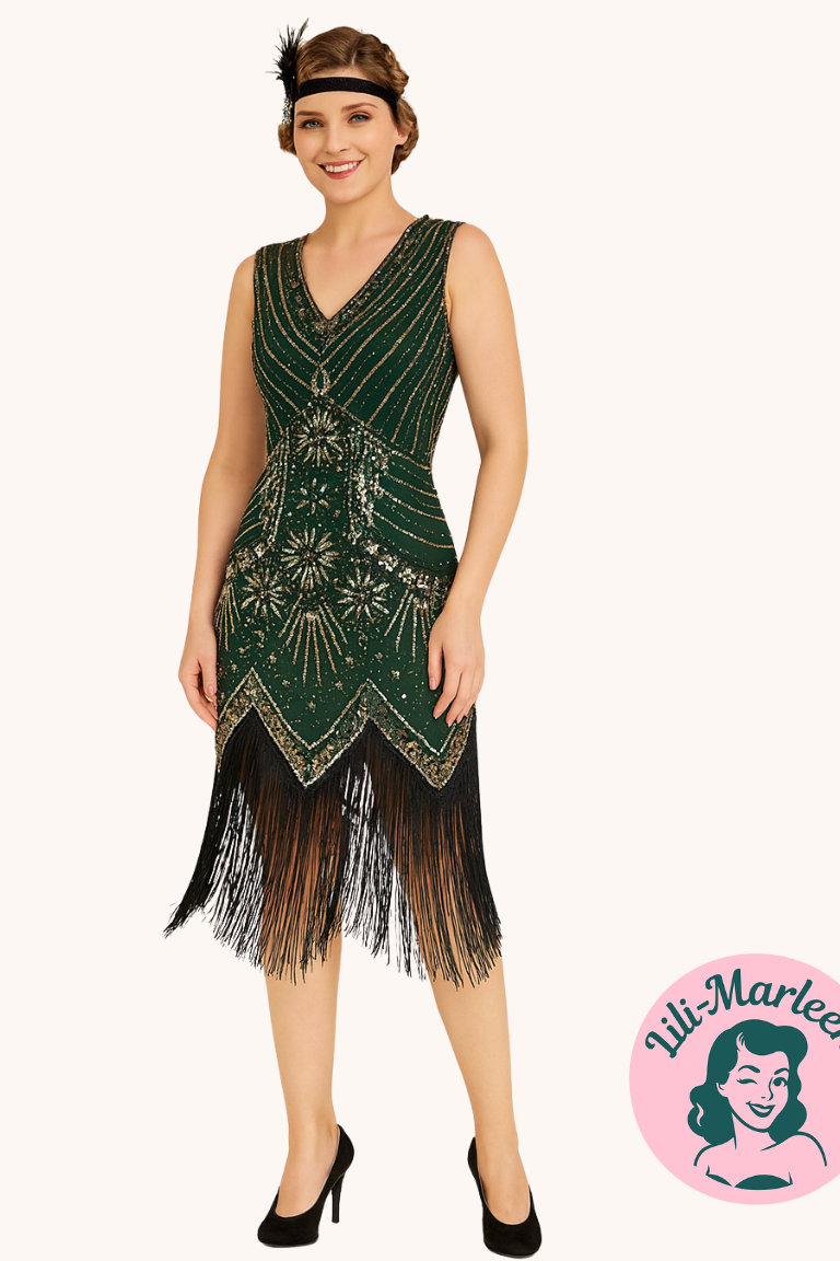 Oplev glamouren fra 1920'erne med Miss Adele i grøn – den perfekte festkjole til din næste store begivenhed!