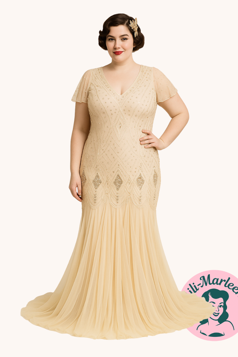 En betagende 1920’er-inspireret festkjole i en elegant cremefarve, dekoreret med smukke perler og glitrende pailletter i et kunstnerisk mønster. Miss Sage har en sofistikeret V-udskæring, der fremhæver barmen, og en lang, bølgende nederdel i blød tyl, som skaber en glamourøs silhuet. Kjolen er perfekt til Gatsby-temafester, gallafester, bryllupper og andre festlige begivenheder, hvor du ønsker et eksklusivt vintage-look.