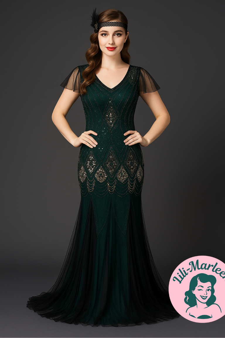 En elegant og luksuriøs 1920’er-inspireret festkjole i en smuk smaragdgrøn nuance med sort tyl, dekoreret med glitrende pailletter og fine perledetaljer. Miss Sage har en sofistikeret V-udskæring og gennemsigtige ærmer, der giver et feminint og elegant touch. Den lange, flydende nederdel i blød tyl skaber en glamourøs havfrue-silhuet, perfekt til gallafester, Gatsby-temafester, bryllupper og andre festlige begivenheder.