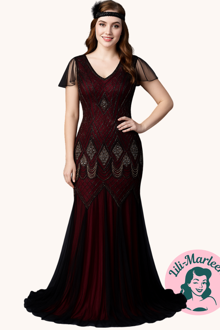 En eksklusiv og elegant 1920’er-inspireret festkjole i en fortryllende vinrød nuance med sort tyl, dekoreret med skinnende pailletter og fine perledetaljer. Miss Sage har en sofistikeret V-udskæring og gennemsigtige korte ærmer, der tilføjer et ekstra strejf af elegance. Den lange, flydende nederdel i blød tyl skaber en smuk havfrue-silhuet, perfekt til gallafester, Gatsby-temafester, bryllupper og andre luksuriøse begivenheder.