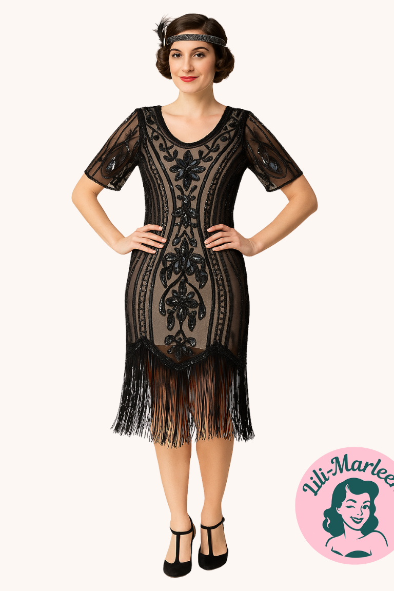 Find din perfekte 1920’er festkjole med Miss Ninnas Song i champagne/sort og gør din næste fest uforglemmelig!