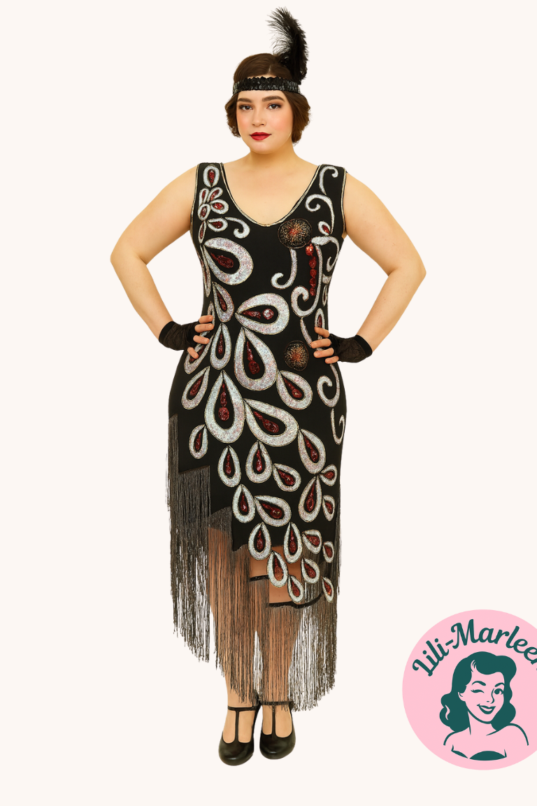 Denne kjole er IKKE klæd-ud-tøj, men en festkjole i høj kvalitet! Materiale: 100% polyester med bløde frynser, perler og pailletter Lukning: Skjult lynlås i siden Pasform: Figursyet og behagelig at have på Pleje: Kun rens (dry clean only)