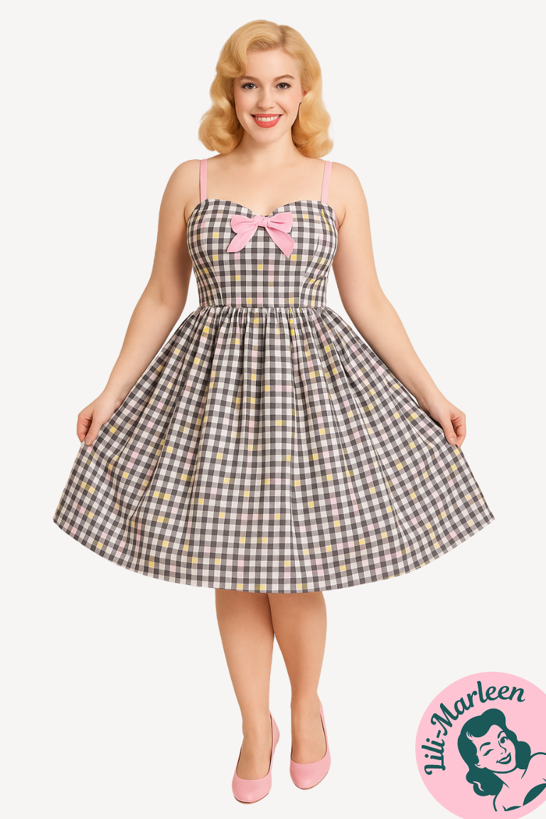 Gør dig klar til at stråle i vores skønne Fruitylou-kjole, der emmer af retrocharme og sommerens glæder! Denne 50'er-inspirerede kjole er lavet i blød bomuld med en grå/hvid gingham-base, der er prydet med små, farverige frugter.