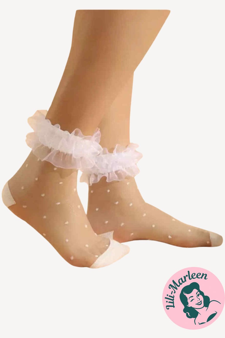 Giv dine fødder et strejf af vintage-chic med disse romantiske strømper i let, transparent materiale. De små hvide prikker og den bløde dobbelte flæsekant ved anklen gør dem perfekte til alt fra ballerinaer til stiletter – eller bare når du vil føle dig ekstra fin.