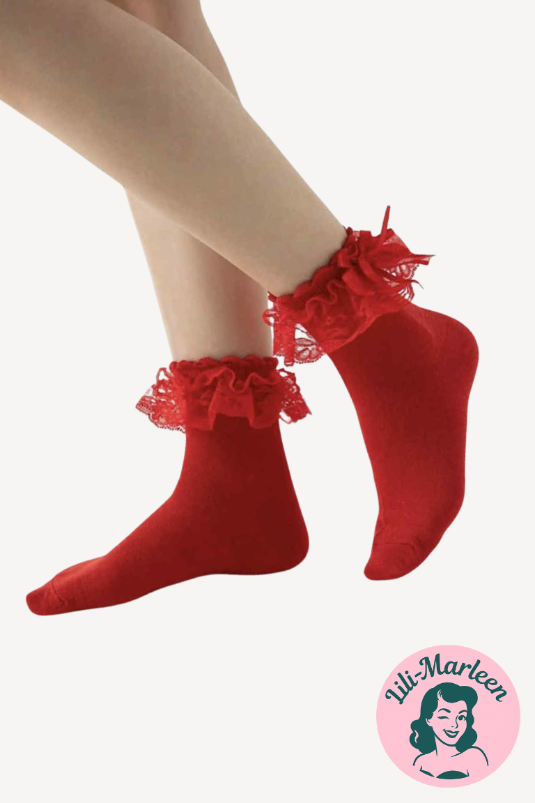Disse røde ankelsokker med fin blondekant er et perfekt tilbehør til dig, der elsker det romantiske, søde og klassiske look. De er lavet i blødt, strækbart materiale og afsluttes med en smukt rynket blondekant, som stikker dekorativt op over sko eller sneakers.