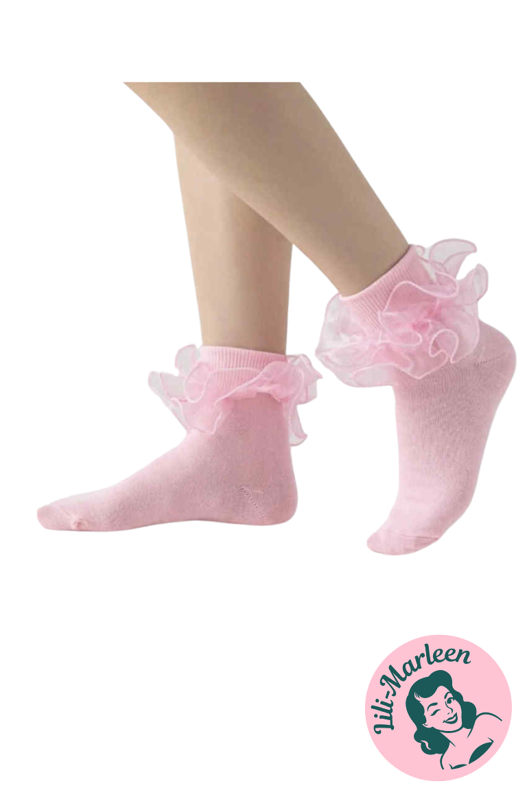 Ankelsokker med satinkant – lyserød ruffle-perfektion