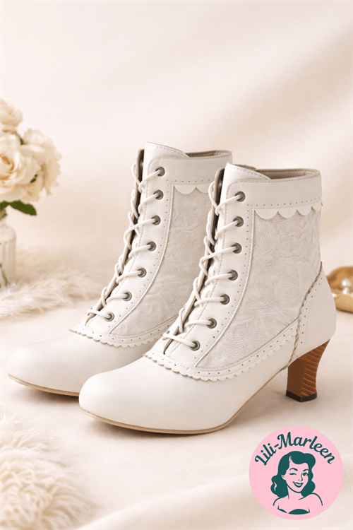 Miss Ivory Belle er en klassisk snørestøvle i kunsthvidt læder med lav hæl og fine vintage-detaljer. Formen er feminin uden at blive skrøbelig, og hælen giver stabilitet nok til, at du faktisk kan gå i dem – hele dagen.