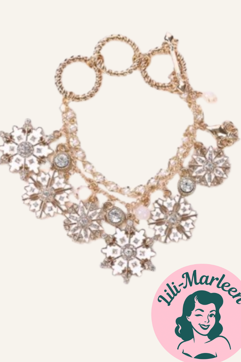 Armbånd med snefnug og krystaller – Guldlook Et elegant og iøjnefaldende armbånd, der kombinerer glamour og vintermagi. Armbåndet er udsmykket med smukke snefnugvedhæng, funklende krystaller og små perledetaljer, der skaber et festligt og feminint udtryk. Perfekt til julefrokoster, vinterbryllupper eller som et unikt smykke til hverdag, hvor du ønsker lidt ekstra glans.