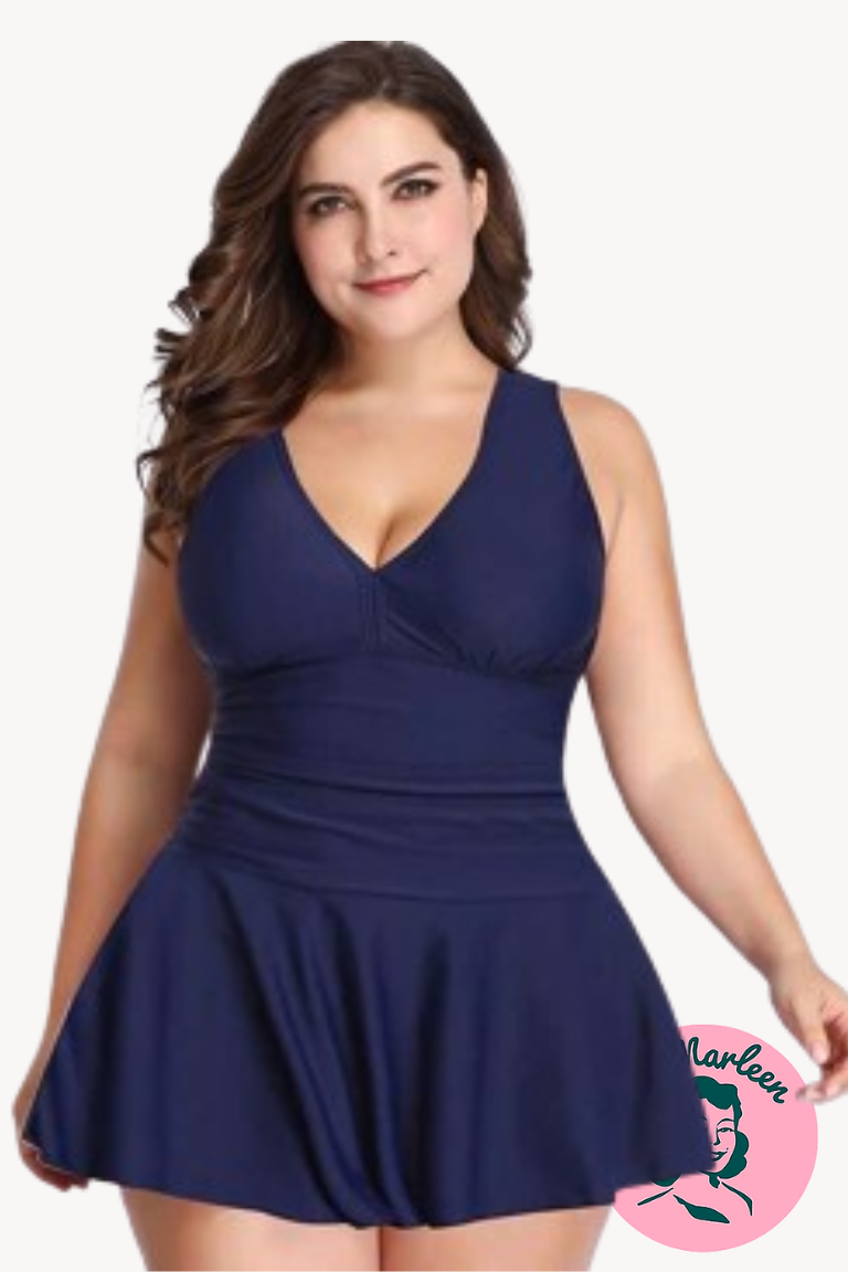 Detaljer og design: Materiale: Nylon & elastan – blødt, strækbart og hurtigtørrende Farve: Klassisk mørkeblå Pasform: V-hals med bredere stropper for god støtte Skørt: Let sving og god længde, så du føler dig godt tilpas