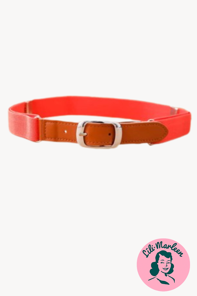 Et dejligt elastikbælte i klar jordbærrød med klassisk cognacfarvet spænde, der giver et sødt, legesygt og vintage-inspireret pift til ethvert outfit. Perfekt til både piger og drenge, uanset om det skal styles til en swingkjole eller et lille jakkesæt. Bæltet holder tøjet på plads – og gør det med masser af farve og personlighed.