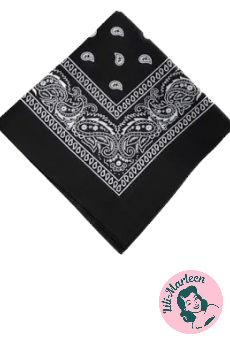 Et evigt tidløst accessory: den sorte bandana med klassisk paisley-mønster. Brug den som tørklæde, hårbånd eller lommeklud, og tilføj et råt og stilfuldt præg til dit look. Den dybe sorte farve gør den let at kombinere med både retro- og hverdagsoutfits.