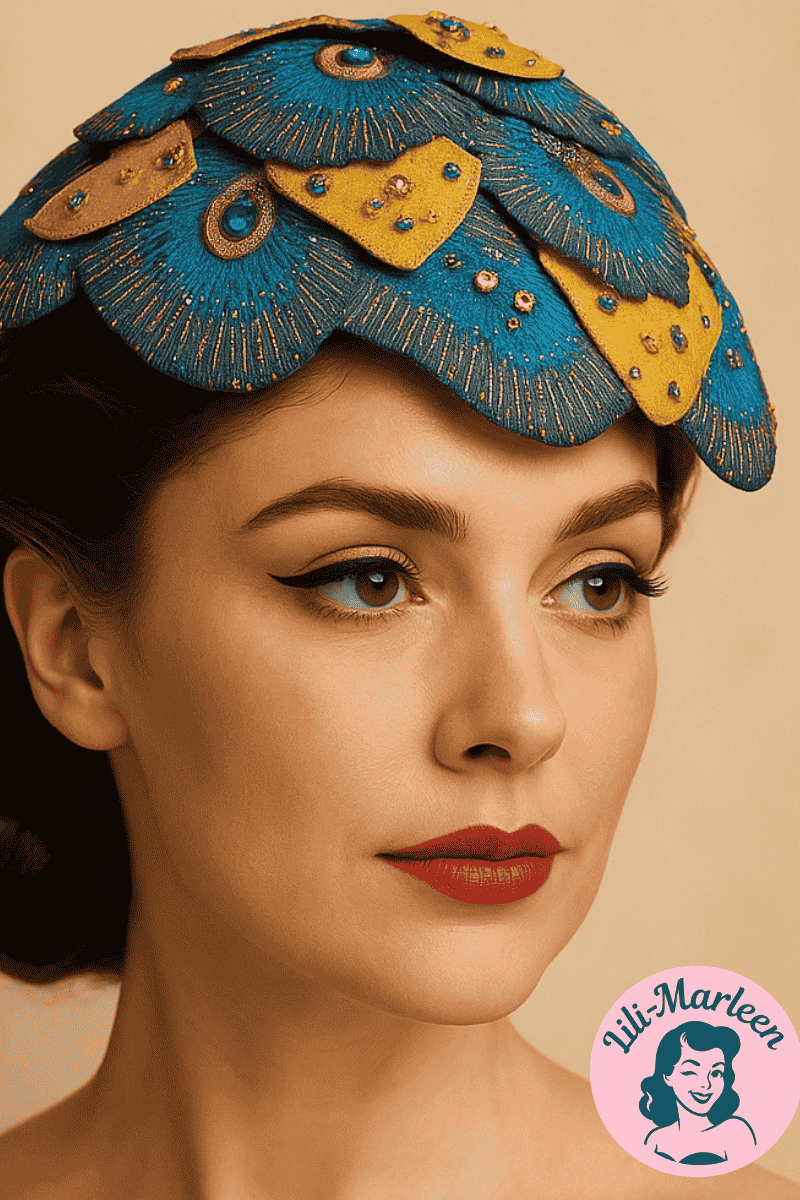 Et levende stykke bærbar kunst – designet og håndlavet af Miss Monroe selv. “Miss Peacock” er et unika – der findes kun én, og det bliver der ved med. Skabt med vintage elegance, kraftfuldt farvespil og et drys dekadence, bringer den minder om 1950’ernes showgirls og haute couture-hatte – men med et moderne twist.