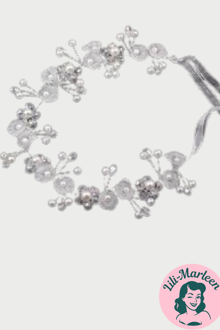 En elegant og tidløs blomsterkrans i klar og hvid, pyntet med perler og sten, der giver et skinnende og romantisk udtryk. Kransen bindes med satinbånd, så den let kan tilpasses og sidder behageligt. Perfekt som hårpynt til bryllup, konfirmation, dåb eller andre festlige lejligheder, hvor et feminint og glamourøst look ønskes.