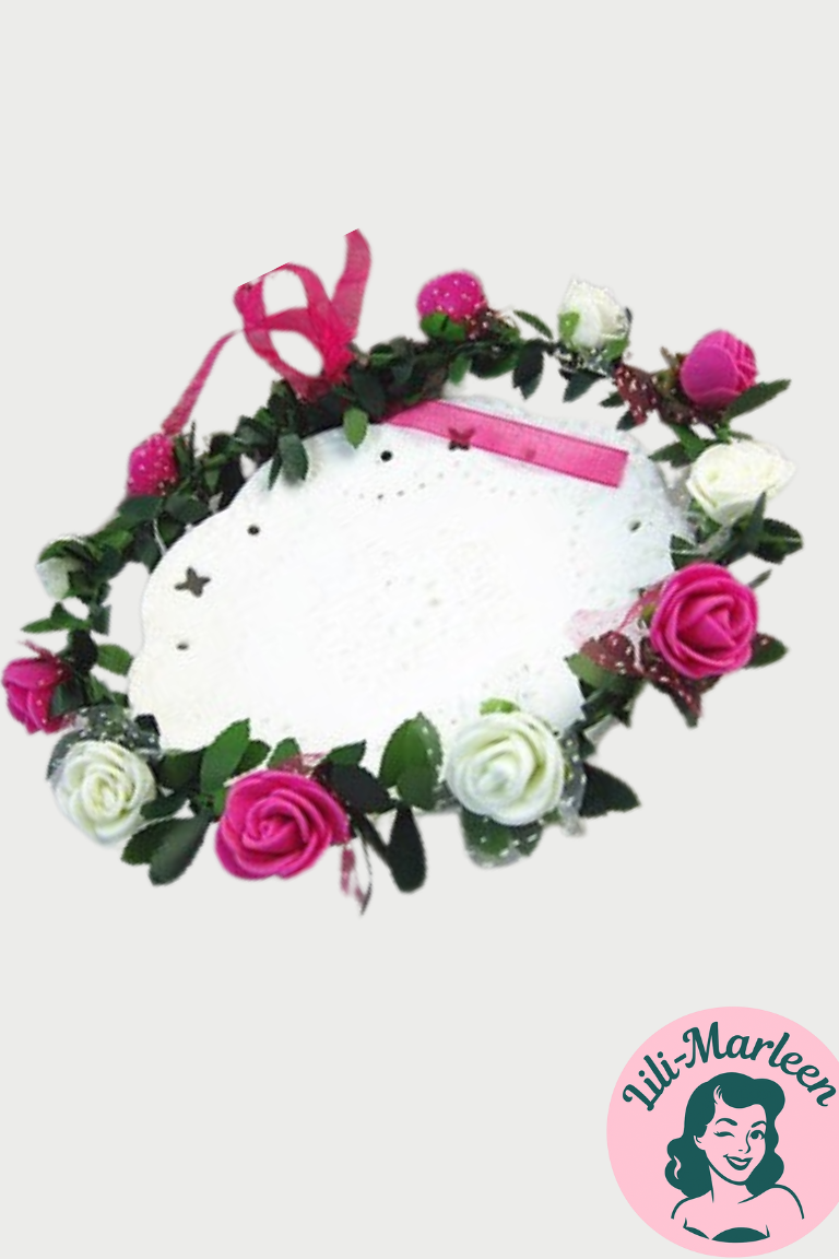 Pink & White Delight er en frisk og romantisk blomsterkrans, der kombinerer renheden i hvide roser med legende pink nuancer. Grønne blade og fine tyl-detaljer fuldender looket og skaber et feminint, festligt og naturligt udtryk. Kransen bindes med satinbånd, så størrelsen kan justeres, og den passer både børn og voksne. Perfekt til konfirmation, bryllup, sommerfester eller festivaler.