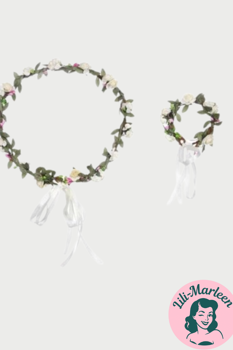 En enkel og naturlig blomsterkrans med matchende armbånd i hvid. Designet med små hvide blomster, grønne blade og hvide satinbånd giver dette sæt et romantisk og klassisk udtryk. Perfekt til dåb, konfirmation, bryllup eller som blomsterpige-accessory.
