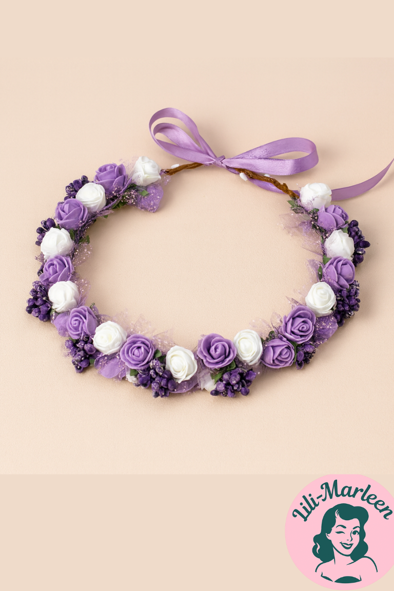 En romantisk blomsterkrans i lilla og hvid med små detaljer, der skaber et feminint og elegant udtryk. Kransen bindes med satinbånd og kan justeres i størrelsen, så den passer perfekt. Den er ideel til konfirmation, bryllup, dåb eller som en smuk accessory til fest og fotografering.