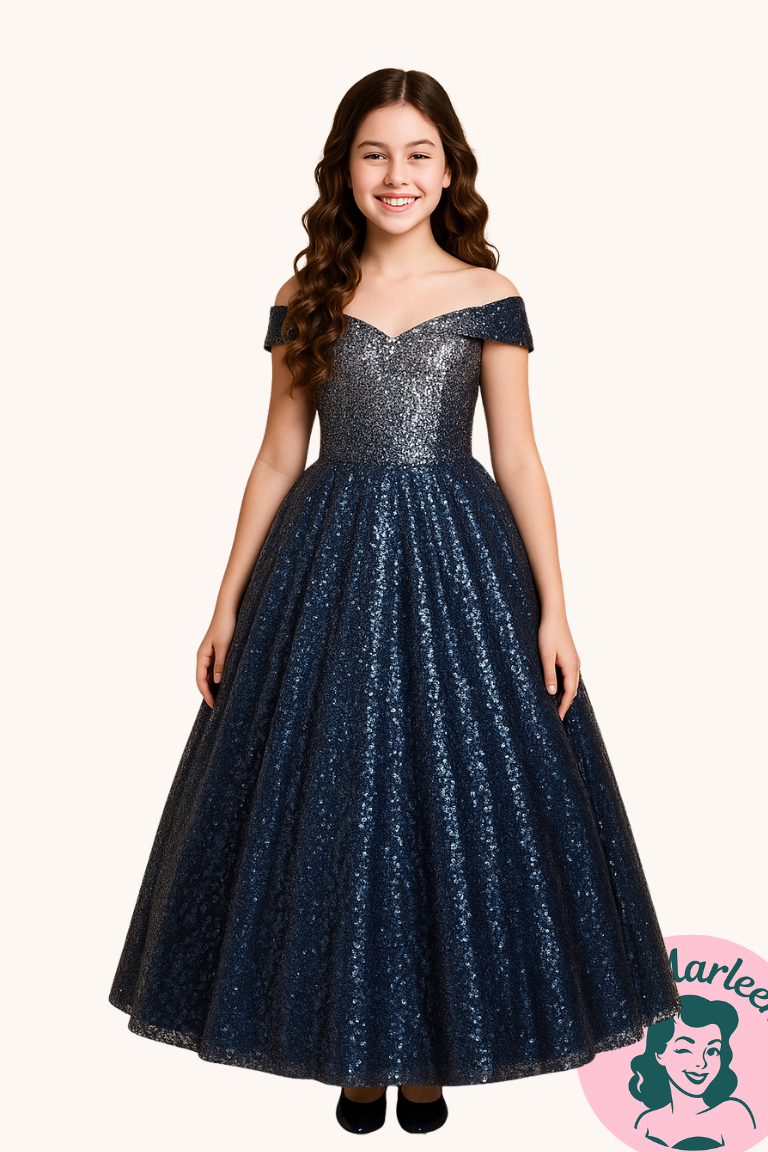 Børnefest/gallakjole – Little Callie – Navyblå pallietdrøm i sølv med snøre i ryggen - Little Callie er en ægte pallietdrøm i navyblå og sølv – en gulvlang fest- og gallakjole, der stråler af elegance. Med sit off-the-shoulder design, smukke snøre i ryggen og en aftagelig sløjfe er kjolen perfekt til store øjeblikke, hvor din prinsesse skal skinne.