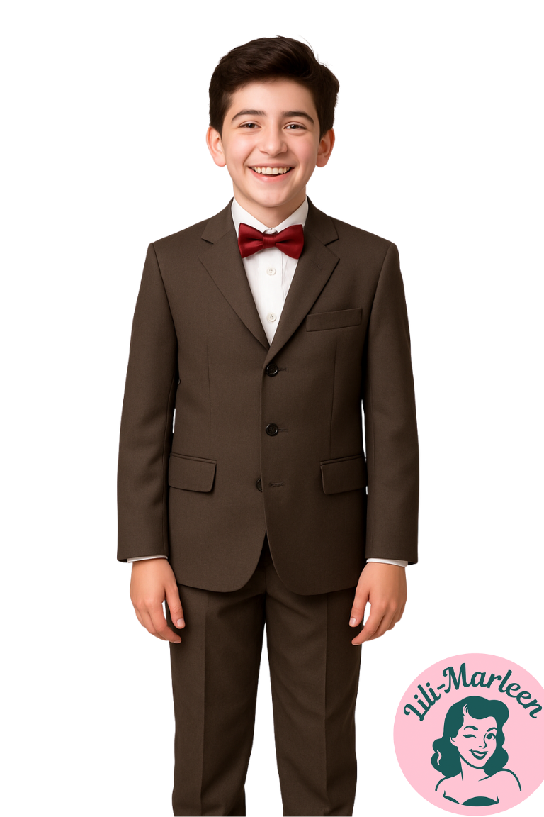 Atlas-jakkesættet i brun er et elegant og anderledes valg til drenge, der ønsker et klassisk look med et varmt og tidløst præg. Den brune farve giver et mere jordnært og sofistikeret udtryk, perfekt til konfirmation, bryllup, jul eller andre festlige begivenheder. Med fem dele – blazer, bukser, vest, skjorte og butterfly/slips – får du et komplet outfit, der kombinerer komfort med stil.