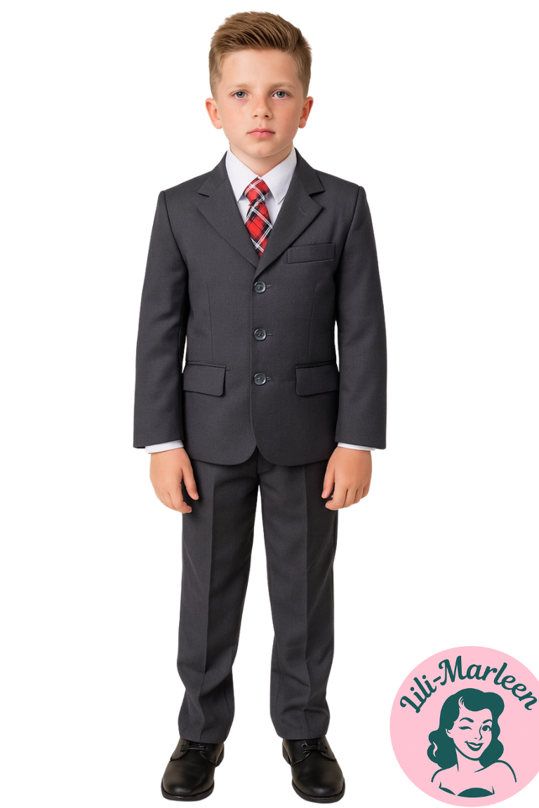 Atlas-jakkesættet i mørkegrå er det oplagte valg til drenge, der ønsker et klassisk og moderne look på én gang.