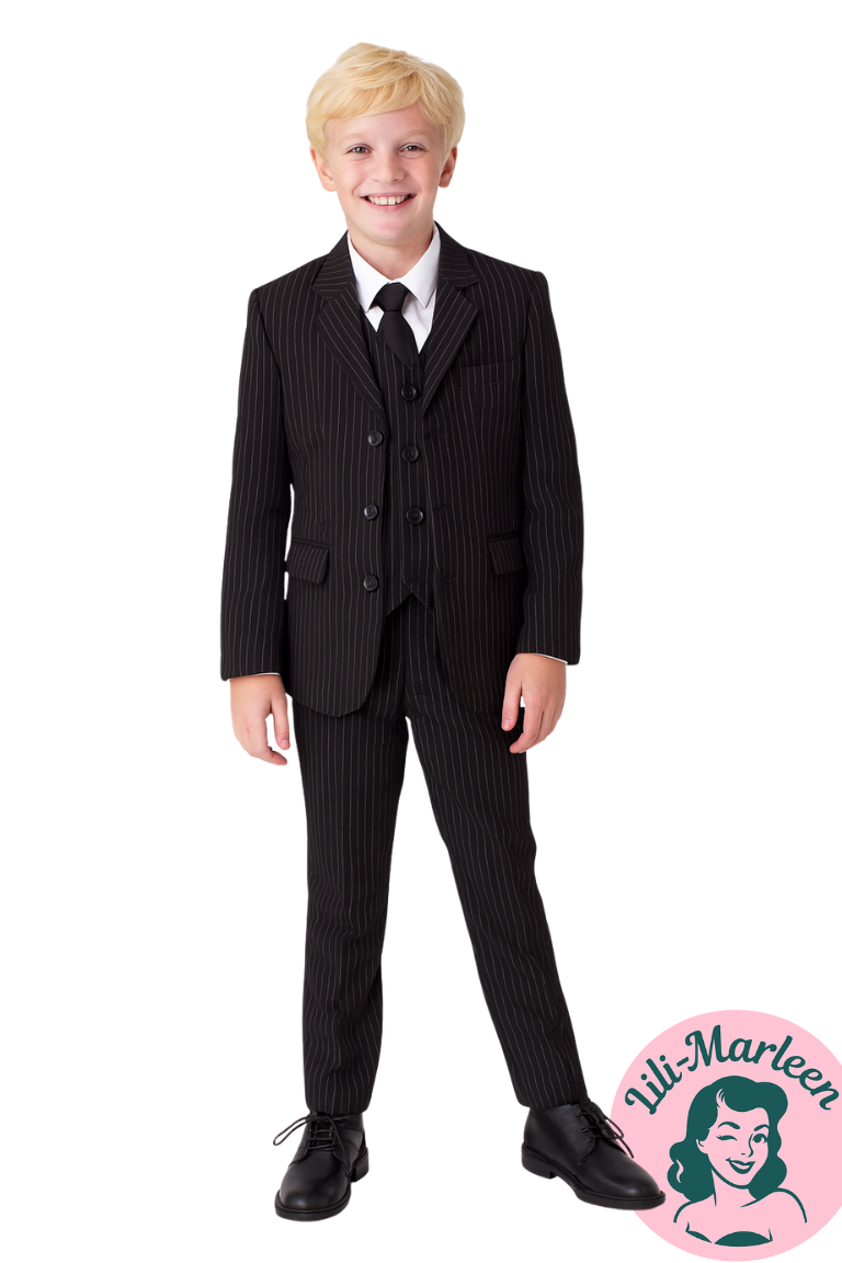 Kenneth-jakkesættet i klassisk sort med hvide nålestriber er et tidløst valg til drenge, der ønsker et sofistikeret look med kant. Nålestriber har længe været et symbol på stil og selvsikkerhed, og dette sæt er ingen undtagelse. Perfekt til konfirmation, bryllup, julefest eller andre højtider, hvor elegance er i centrum. Med fem dele – blazer, bukser, vest, skjorte og slips – får du et komplet outfit, der udstråler klassisk herremode i børnestørrelse.