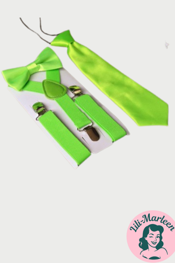 Dette børnesæt med limegrøn butterfly, slips og seler er en sjov og stilfuld accessory-pakke, der fuldender ethvert outfit med farve og personlighed.