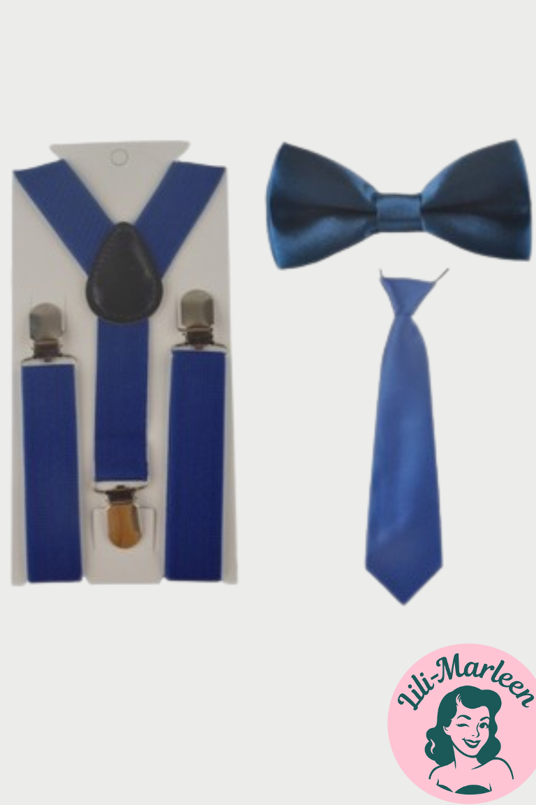 Et elegant og tidløst sæt til børn bestående af butterfly, seler og slips i en dyb blå farve. Den mørkeblå nuance giver et sofistikeret og klassisk look, der passer perfekt til festlige begivenheder og højtider. Selerne er justerbare med stærke clips, og både butterfly og slips er nemme at tage på, hvilket gør sættet både praktisk og stilfuldt.