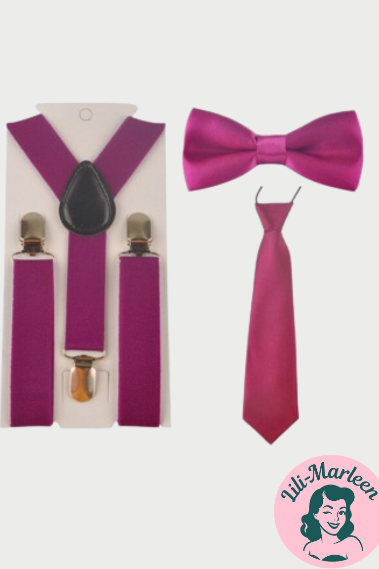Dette børnesæt med magenta butterfly, slips og seler er en farverig accessory-pakke, der fuldender ethvert outfit med energi og stil.