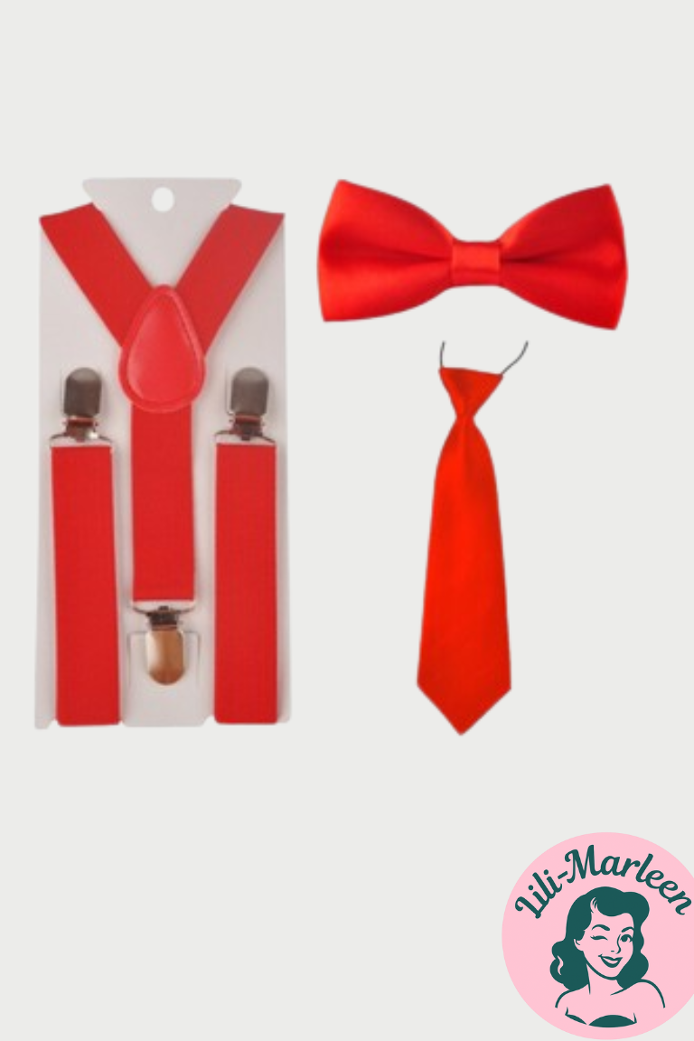 Dette børnesæt med rød butterfly, slips og seler er en elegant accessory-pakke, der fuldender ethvert outfit med farve, stil og personlighed.