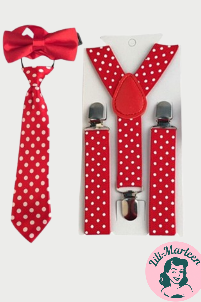 Dette børnesæt med røde seler, slips og butterfly i polkaprikker er en farverig accessory-pakke, der fuldender ethvert outfit med glæde og stil.