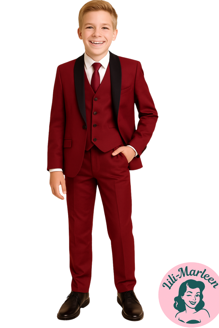 En eksklusiv børne smoking i en dyb vinrød nuance med sorte revers, der giver et sofistikeret og festligt udtryk. Victor Kean-smokingen er designet til drenge, der vil stråle på de helt store dage. Med fem dele – blazer, bukser, vest, skjorte og butterfly/slips – får du et komplet outfit, der udstråler klassisk elegance med et moderne twist.