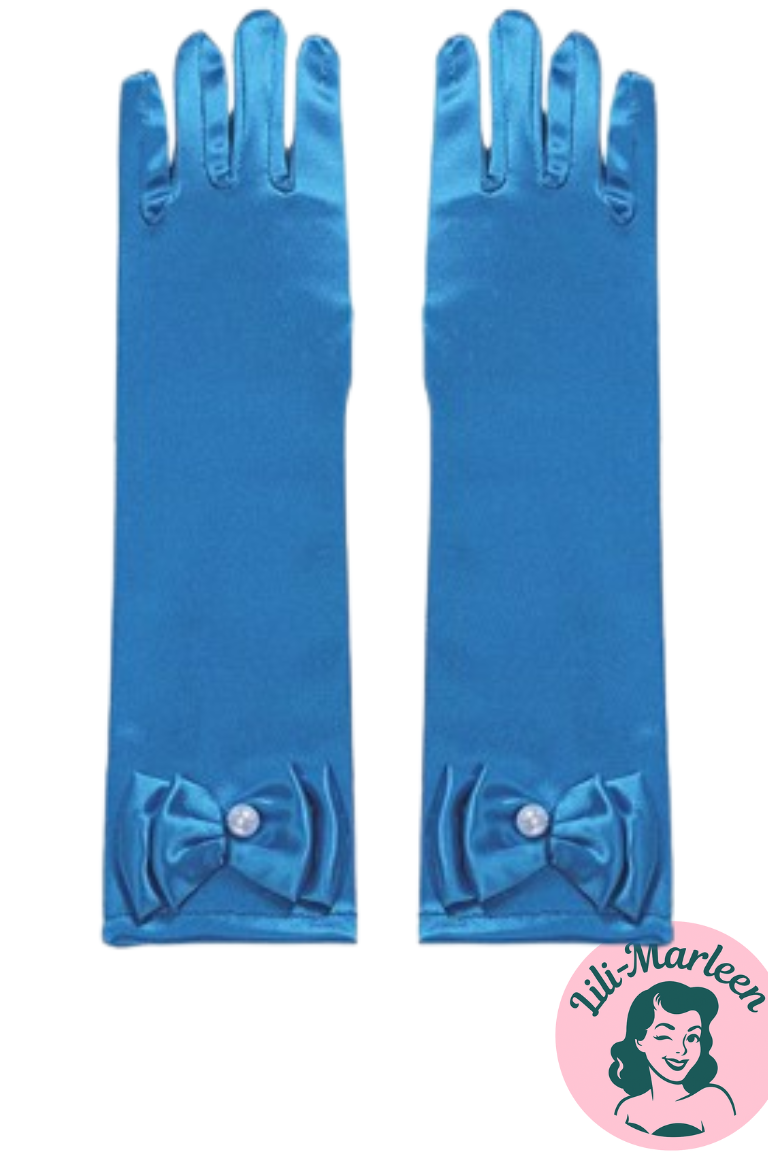 Lange satin festhandsker til børn - søde med sløjfe og lille perle - vi elsker fest og farver!
