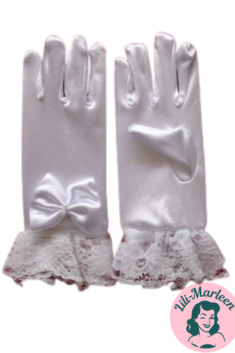 Korte satin festhandsker til børn - søde med sløjfe og små perler - vi elsker fest og farver! De sødeste satinhandsker til børn, der ligner noget fra et eventyr! Disse handsker er taget ud af en ønske drøm og vil give din prinsesse følelsen af at være midt i et eventyr.