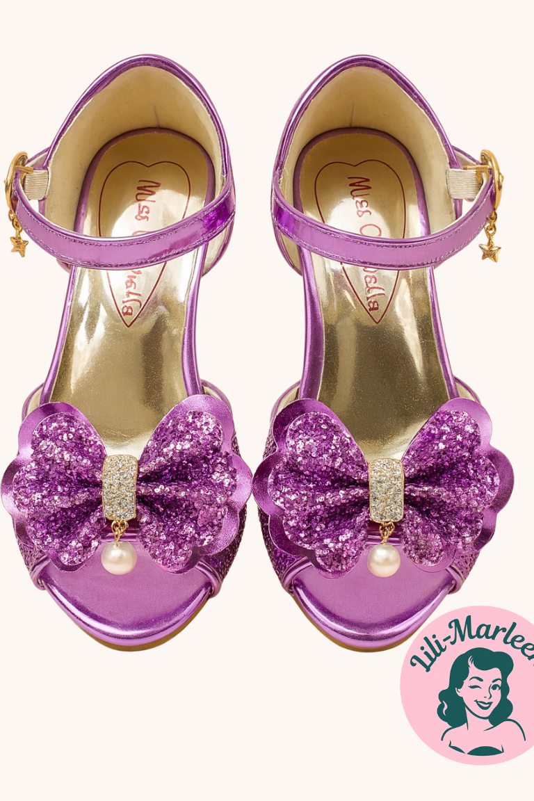 Denne søde festsandal i lilla er skabt til piger, der elsker magi, glitter og prinsessestil. Den smukke sløjfe foran og de glitrende detaljer giver skoen et fortryllende udtryk, perfekt til både fødselsdag, bryllup eller prinsesseleg.