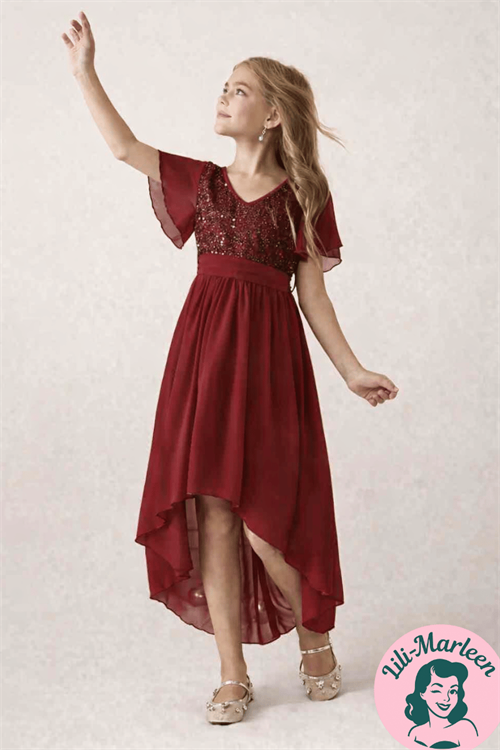 Mini Miss Ruby Grace er en elegant og festklar kjole til piger, der elsker at føle sig både fine og frie. Kjolen har en smuk glitrende overdel og et let, flagrende skørt med asymmetrisk længde, der giver bevægelse og ynde. I taljen sidder et bånd, som kan bindes og justeres, så kjolen sidder behageligt og flatterende.