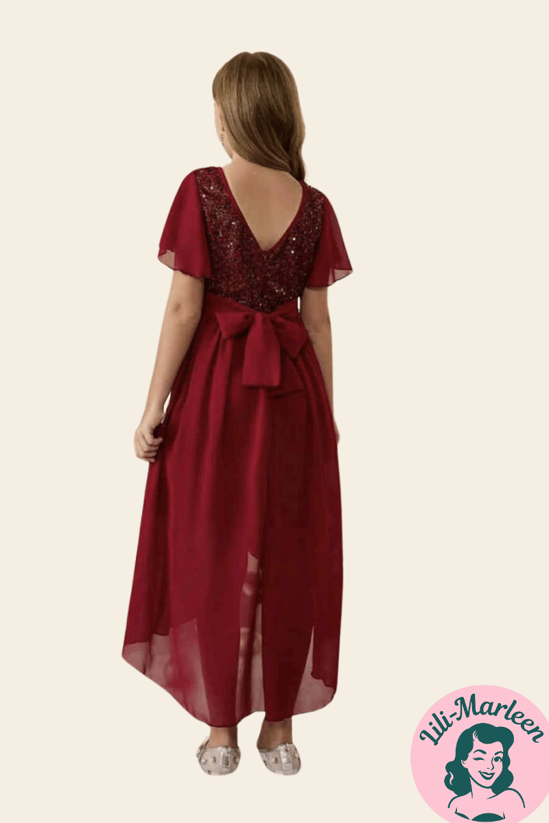 Mini Miss Ruby Grace – Festkjole med glitrende overdel og bånd i taljen