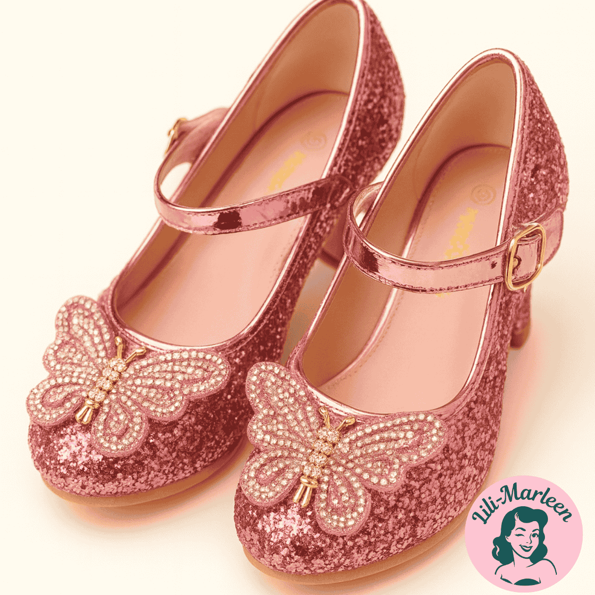 Elegant Design: Alberte festsko i pink har en fortryllende farve, en lille hæl og en yndig sommerfugl, der tilføjer et ekstra touch til festlige lejligheder.