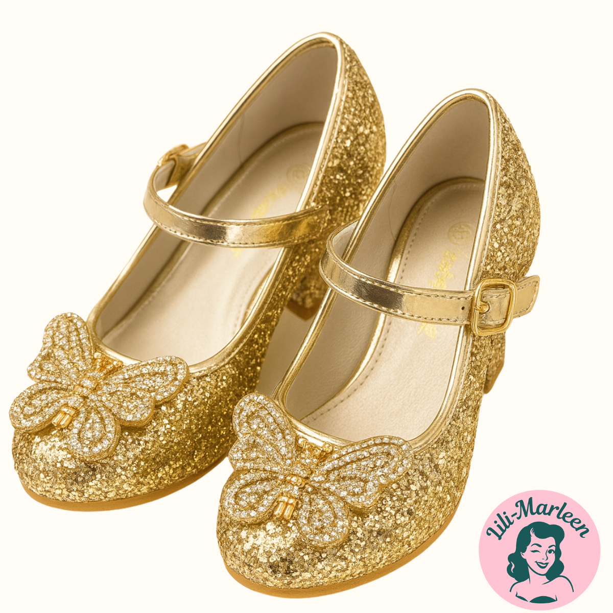 Elegant Design: Alberte festsko i guld har en strålende farve, en lille hæl og en yndig sommerfugl, der tilføjer et ekstra touch til festlige lejligheder.