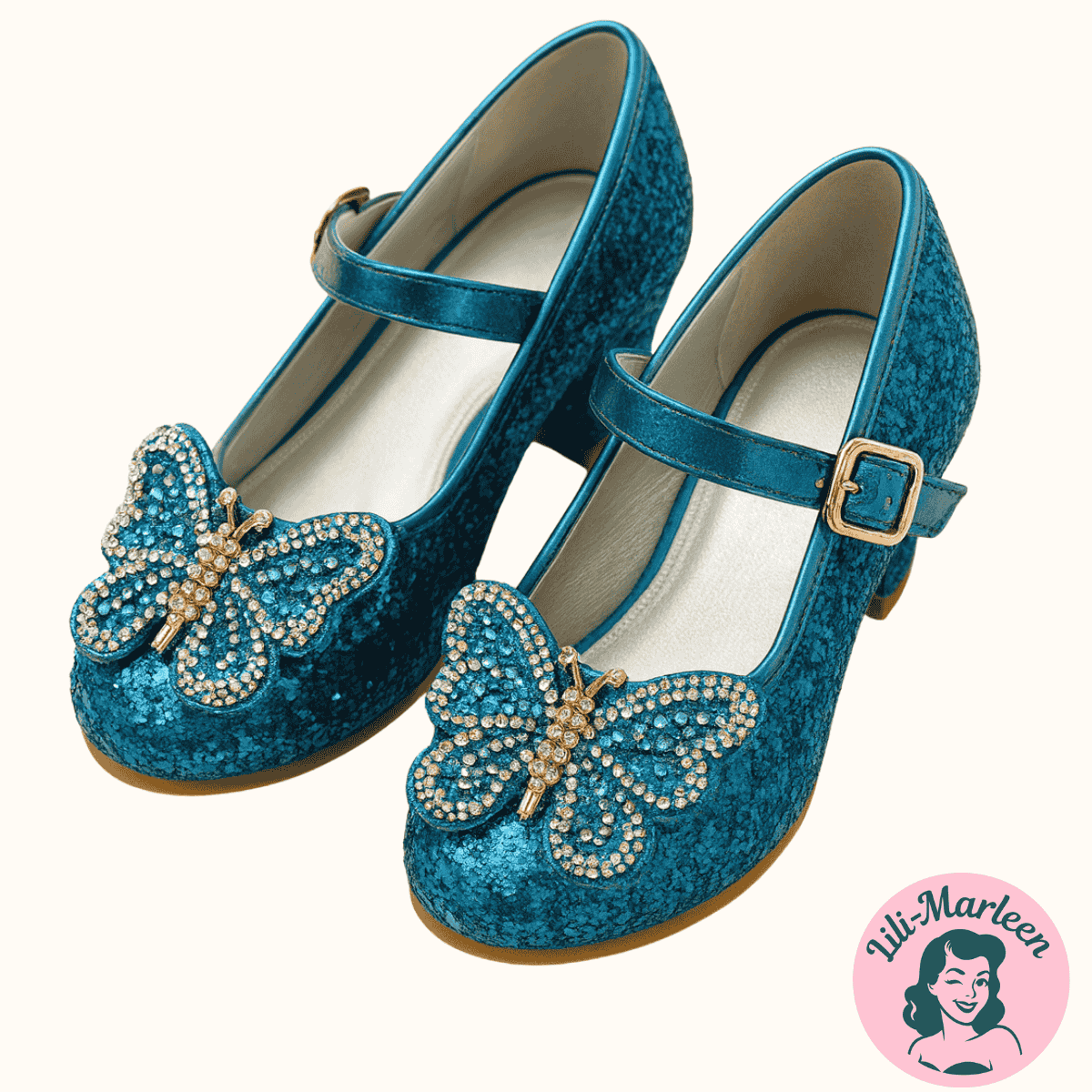 Elegant Design: Alberte festsko har en fortryllende blå farve, en lille hæl og en sød sommerfugl, der tilføjer et ekstra touch til festlige lejligheder.
