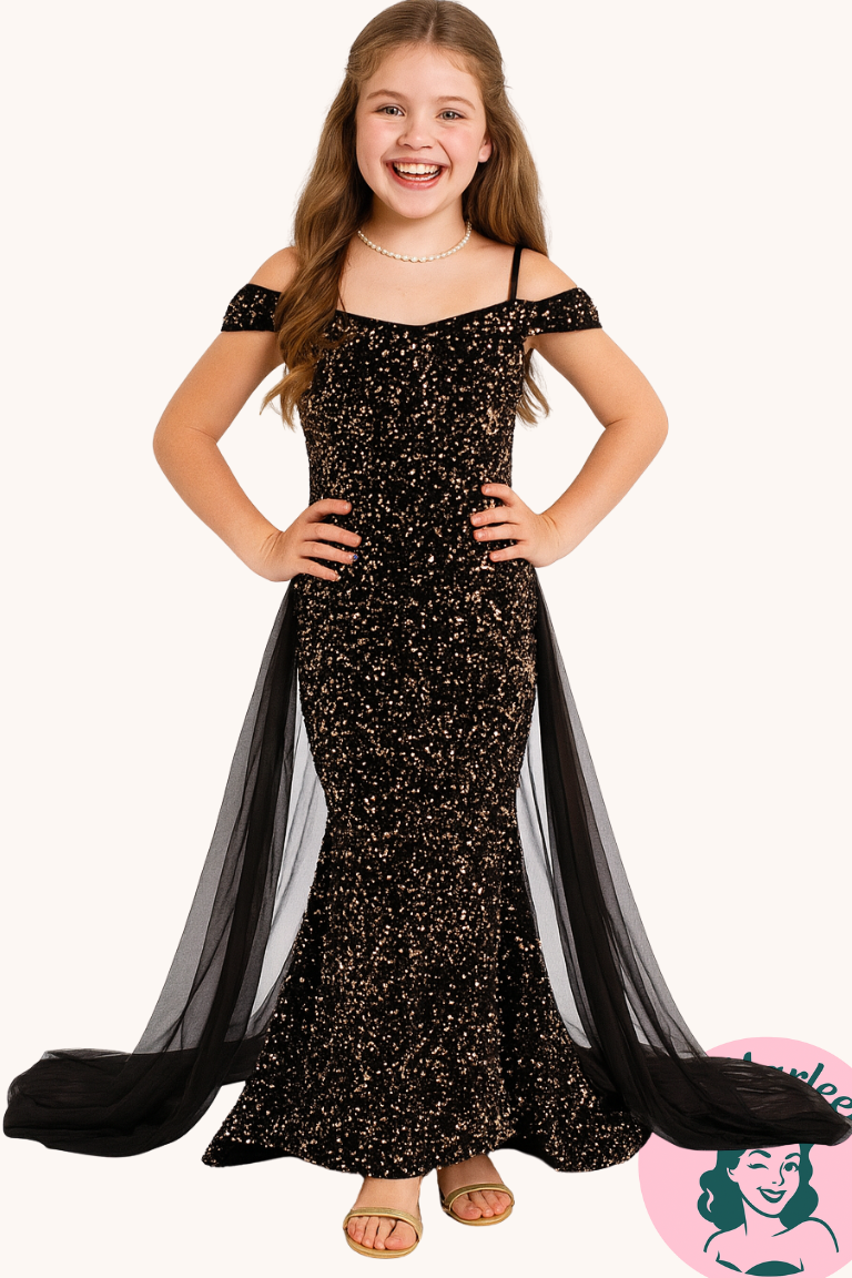 Børnegallakjole - Luciy - Lang børnefestkjole i sort/guld - Havfrue model med palietter - Opfyld prinsessedrømmen med Luciy – en lang børnegallakjole i sort og guld.