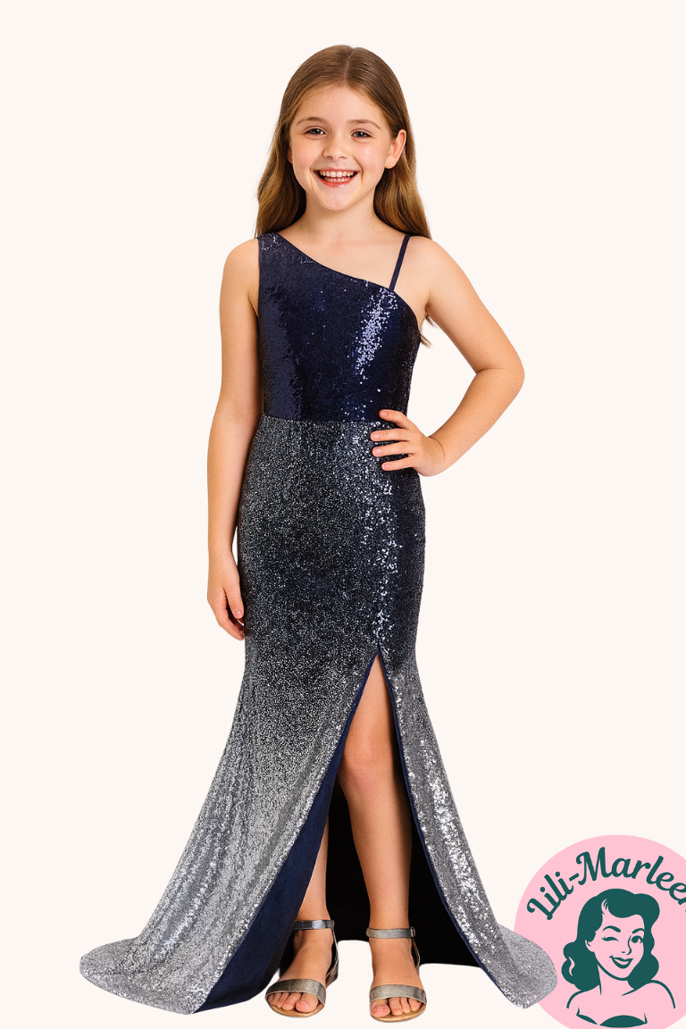 Børnegallakjole - Night Bird - Lang børnefestkjole i blå/sølv - Havfrue model med palietter - Opfyld prinsessedrømmen med Night Bird – en elegant lang børnegallakjole i blå og sølv. Denne unikke festkjole er skabt i en smuk havfrue model med slids foran i siden og dækket af glitrende sølv- og midnatsblå palietter. En kjole, der giver dit barn følelsen af at træde direkte ind i et eventyr – perfekt til gallafester, fødselsdage, konfirmationer eller som brudepigekjole.