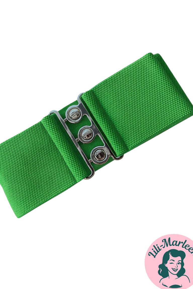 Skab et iøjnefaldende look med dette brede elastiske bælte i en frisk grøn nuance. Perfekt til at fremhæve taljen og tilføje farve og retro-stil til både kjoler, nederdele og buksedragter.