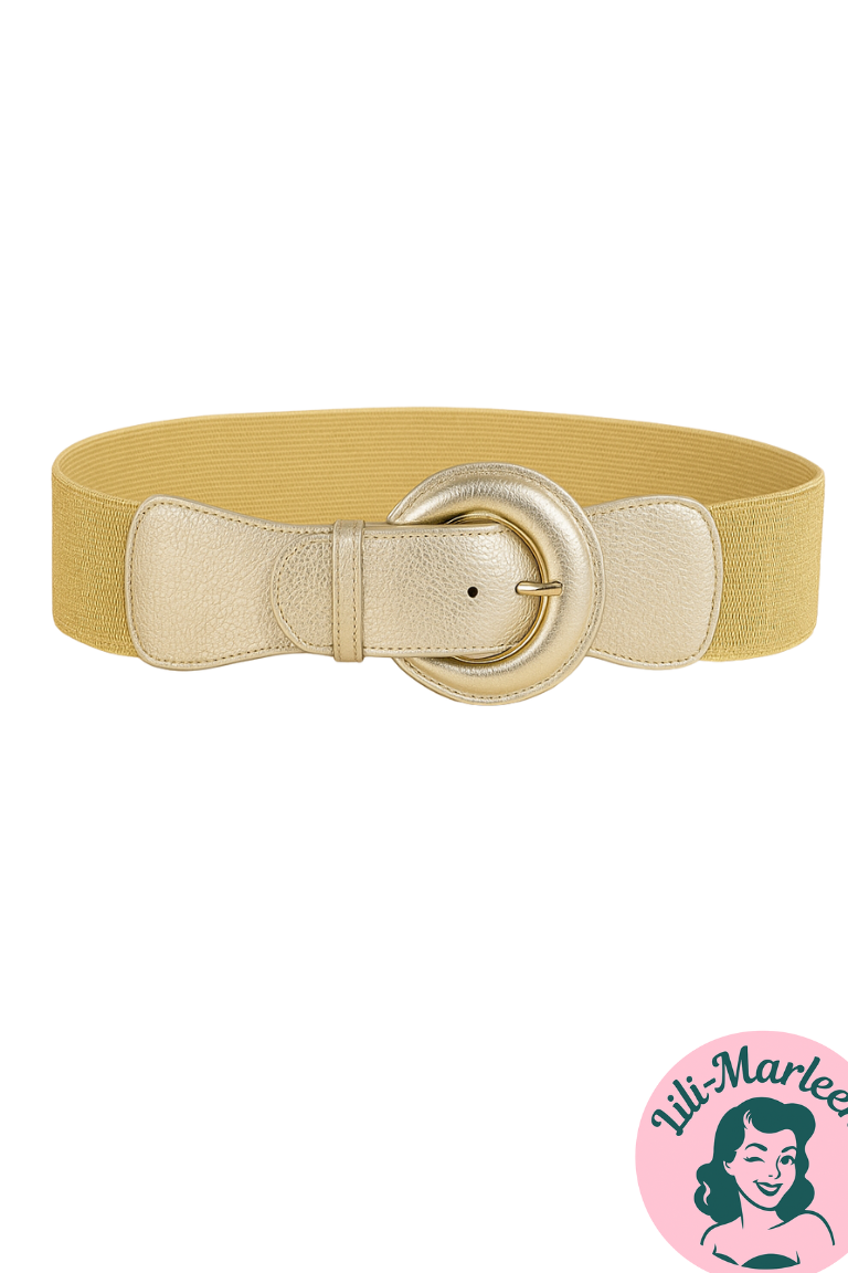 Et bredt elastisk bælte i skinnende guld, der tilføjer dit outfit et luksuriøst og retro-inspireret touch. Perfekt til at fremhæve taljen og give både kjoler, nederdele og toppe et elegant og festligt præg.