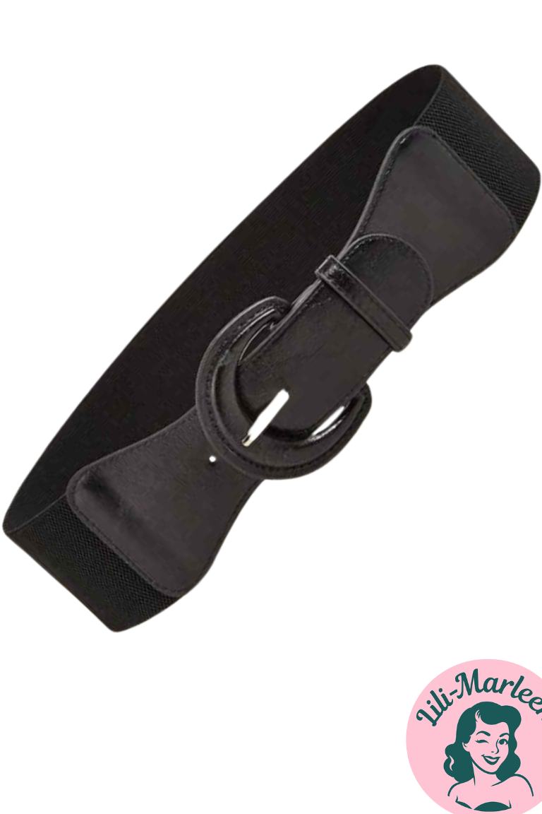 Et tidløst og alsidigt sort elastisk bælte, der fremhæver taljen og fuldender dit outfit med enkel elegance. Det brede design kombinerer en fleksibel elastikryg med en mat front og et markant, buet spænde. Perfekt til kjoler, cardigans eller som stilfuld kontrast til feminine vintage-looks.