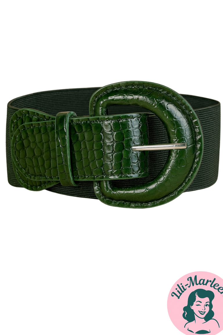 Et bredt elastisk bælte i mørkegrøn med elegant croco-præg, der giver dit outfit et sofistikeret og edgy retro-look. Perfekt til at fremhæve taljen og tilføje et eksklusivt twist til både kjoler, nederdele og toppe.