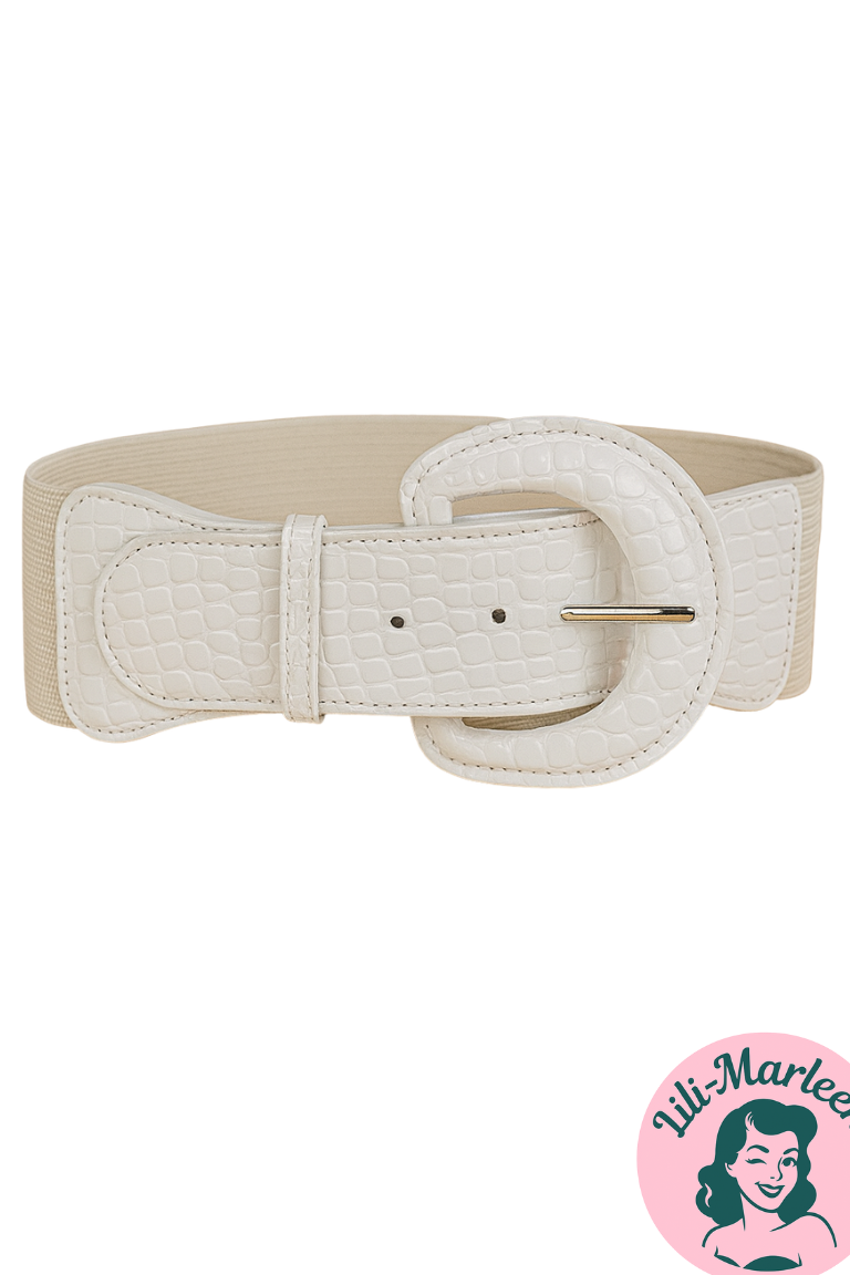 Et bredt elastisk bælte i klassisk hvid med croco-præg, der kombinerer retro-charme med luksuriøse detaljer. Perfekt til at fremhæve taljen og tilføje et stilfuldt og feminint udtryk til både kjoler, nederdele og toppe.