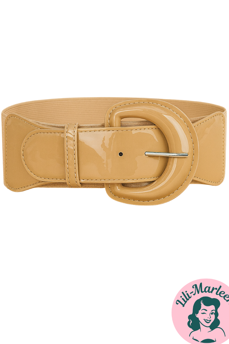 Et bredt elastisk bælte i smuk beige lak-finish, der giver dit outfit et stilrent og sofistikeret retro-look. Perfekt til at fremhæve taljen og skabe et elegant udtryk til både kjoler, nederdele og toppe.