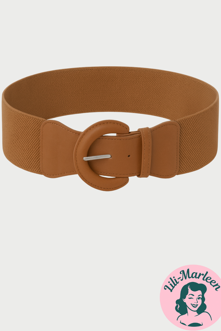 Et bredt elastisk bælte i varm brun nuance med mat læderlook, der giver dit outfit et autentisk og vintage-inspireret præg. Perfekt til at fremhæve taljen og skabe et klassisk retro-udtryk til både kjoler, nederdele og toppe.