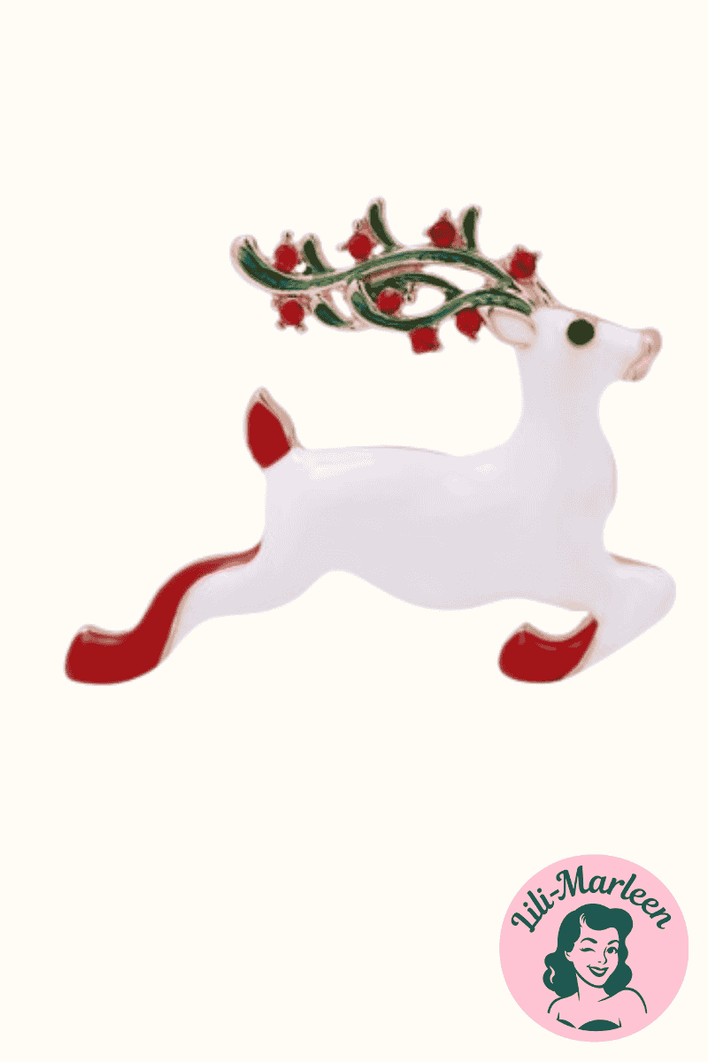 Broche – Winter Fawn – Elegant hvid dådyrbroche med røde og grønne detaljer: Tilføj et strejf af vinterelegance til dit outfit med Winter Fawn – en fortryllende hvid dådyrbroche med røde hove og grønne gevirdetaljer, pyntet med små røde sten. Brochen kombinerer det klassiske juleudtryk med et feminint og stilrent design, der passer perfekt til både kjoler, frakker og cardigans.