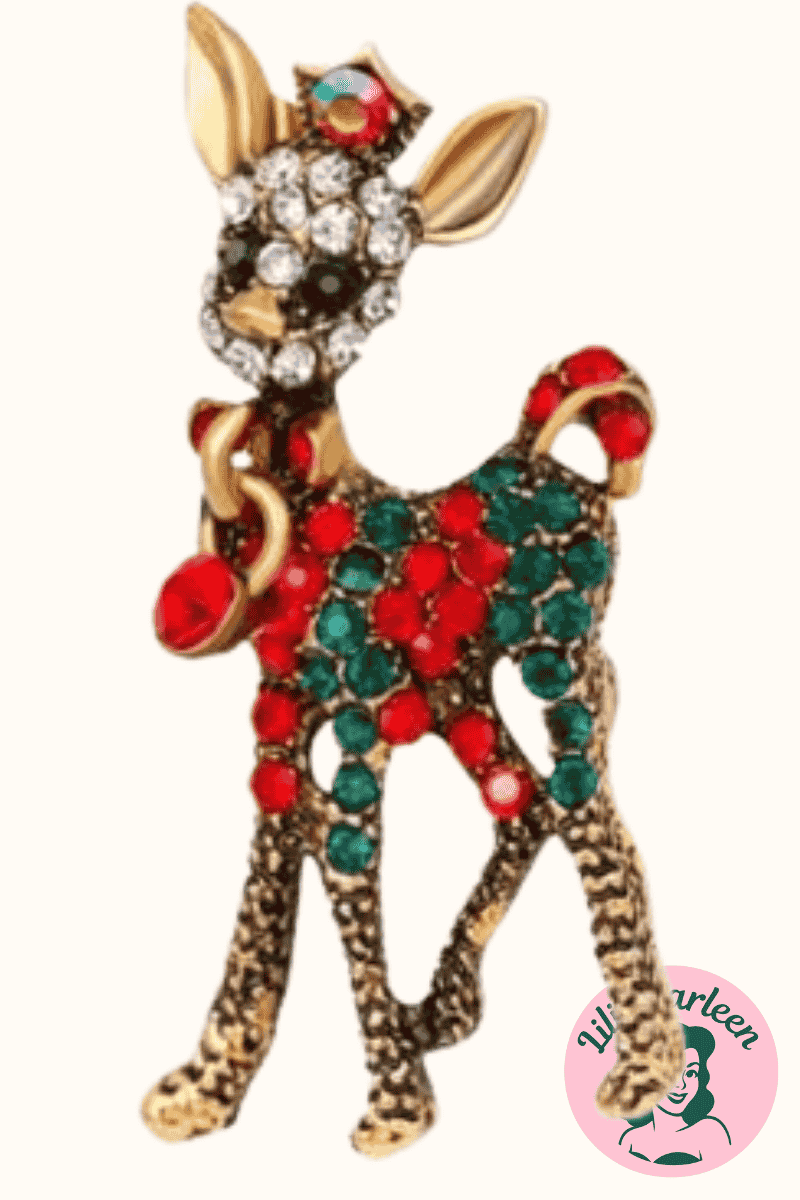 Lad julestemningen funkle med Sweet Fawn – en bedårende broche formet som et lille dådyr, dækket af glitrende røde og grønne sten. De gyldne detaljer og den fine krone på hovedet giver et strejf af vintage-elegance, der gør denne broche både sød og sofistikeret. Perfekt som pynt på kjoler, frakker eller cardigans – eller som gave til en, du holder af.